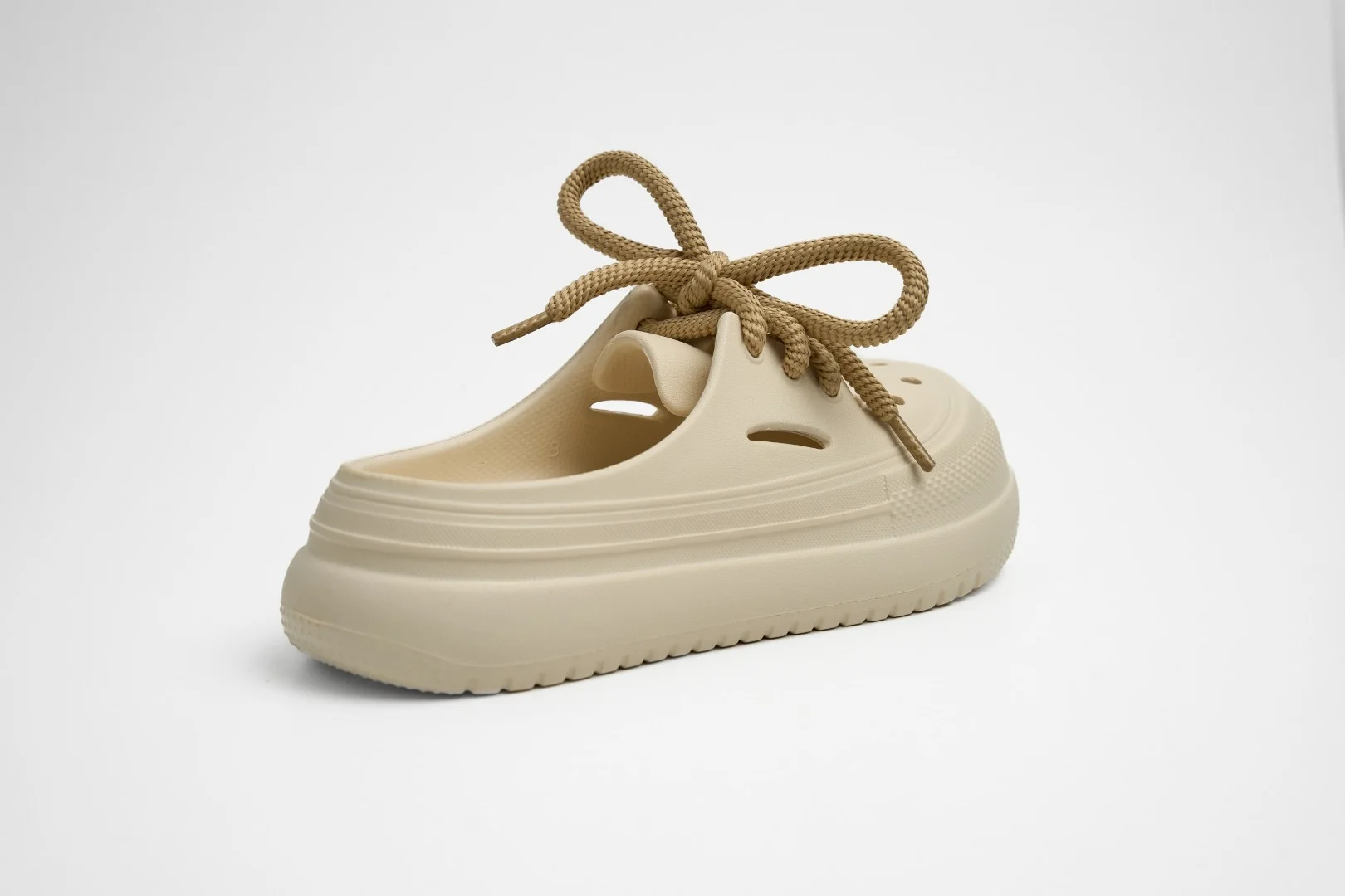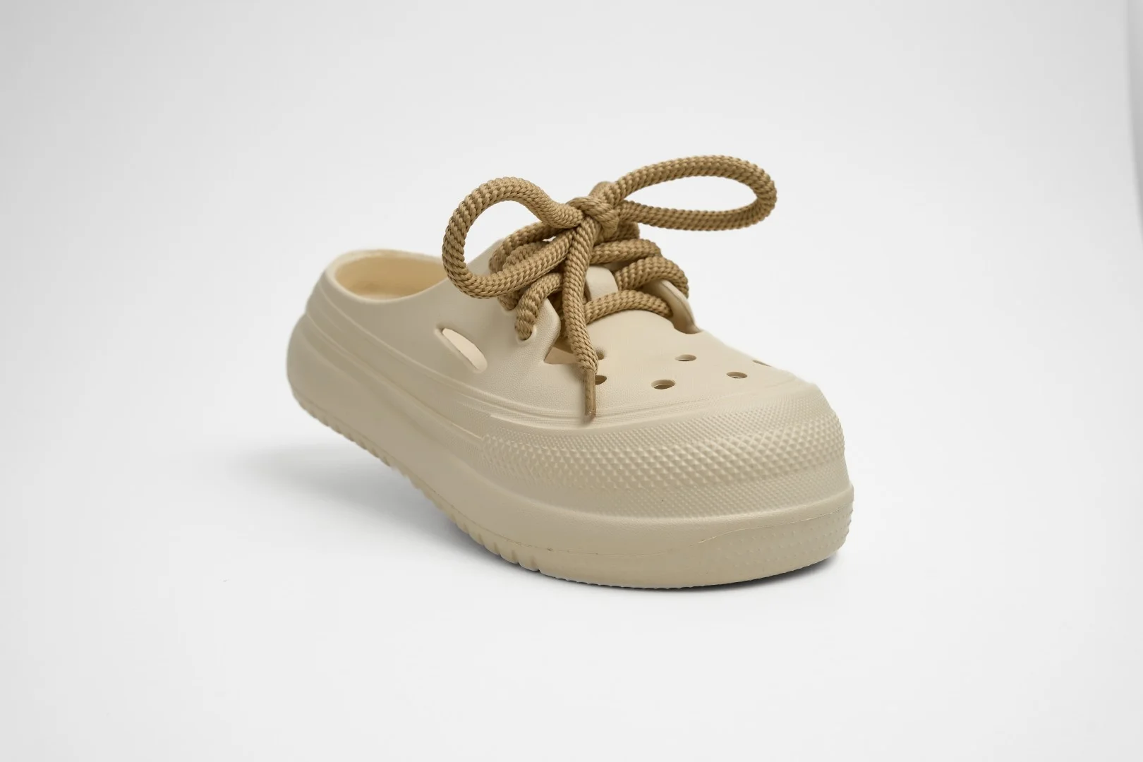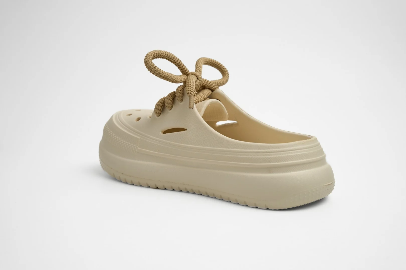 Detalles: Empeine granulado con múltiples orificios circulares y cordones de soga gruesa en color café.